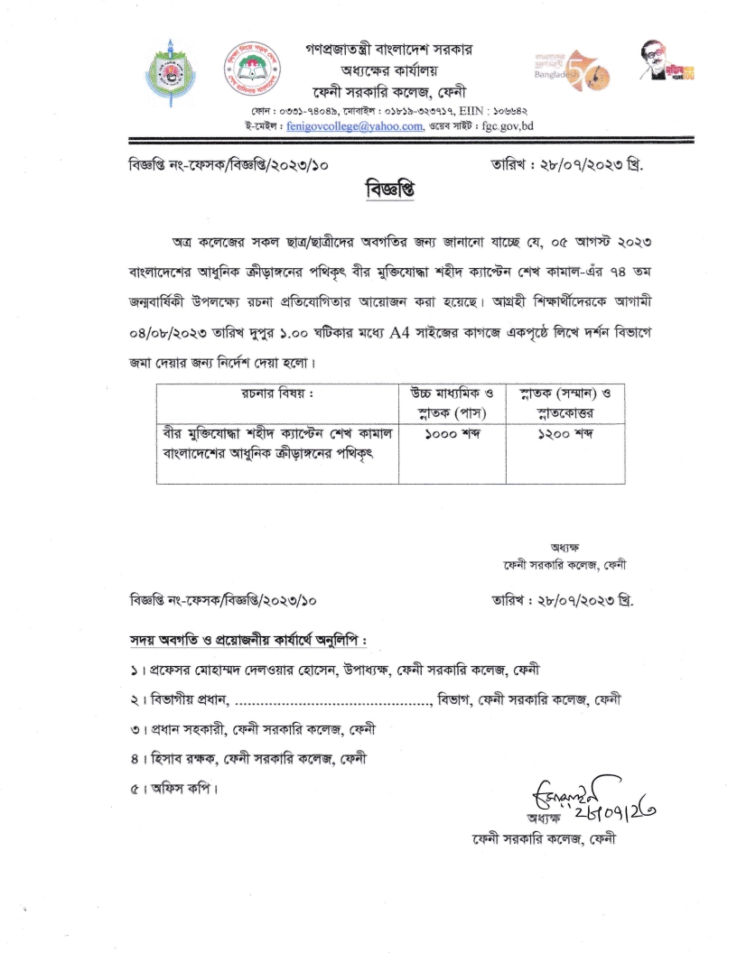 - বীর মুক্তিযোদ্ধা শহীদ ক্যাপ্টেন শেখ কামাল এঁর ৭৪ তম জন্মবার্ষিকী উপলক্ষ্যে রচনা প্রতিযোগিতা সংক্রান্ত বিজ্ঞপ্তি